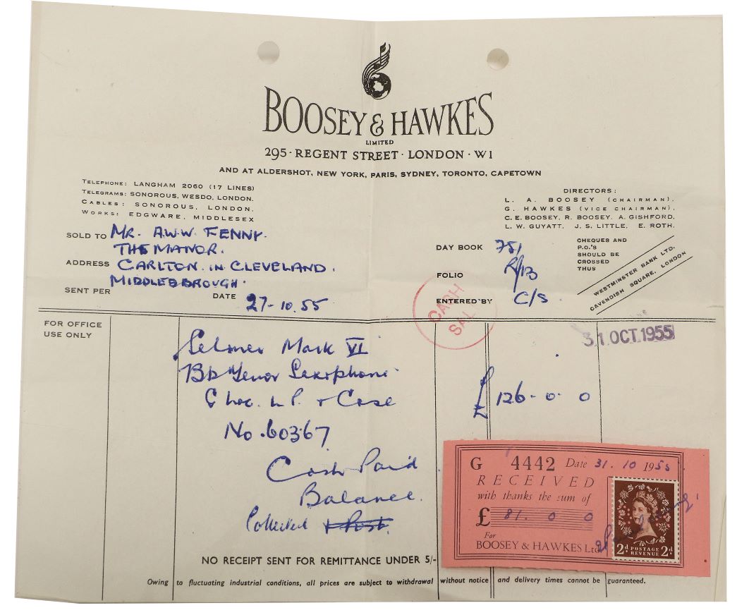 The saxophones are part of a small collection of musical instruments in the sale, which belonged to the late Alan W. W. Fenny, a successful businessman from the North East who was once the largest employer in Stockton-on-Tees. Music was of great importance to Mr Fenny throughout his life, from playing in a band whilst serving as a pilot in the RAF, to playing with the Haverton Hill Silver Band and the Cleveland Pipes and Drums. The saxophones were purchased at Boosey & Hawkes Ltd in London, shortly after his marriage.