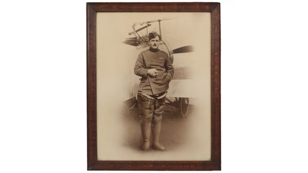 Consigned by another vendor, coincidentally, is a Sepia Vignette Photograph of RFC Pilot Lieutenant William Leefe Robinson, standing before his biplane (estimate: £100-150). Robinson, at the age of 21, became the first airman to shoot down a German airship. On the night of 2nd/3rd September 1916, Robinson was patrolling over Hertfordshire, when he strafed the Schutte-Lanz SL11 airship with incendiary bullets during the largest airship raids of the war. His actions established a fighting technique and marked a turning point in the battle against Zeppelins; Robinson proved became a national hero overnight and was awarded the Victoria Cross.
