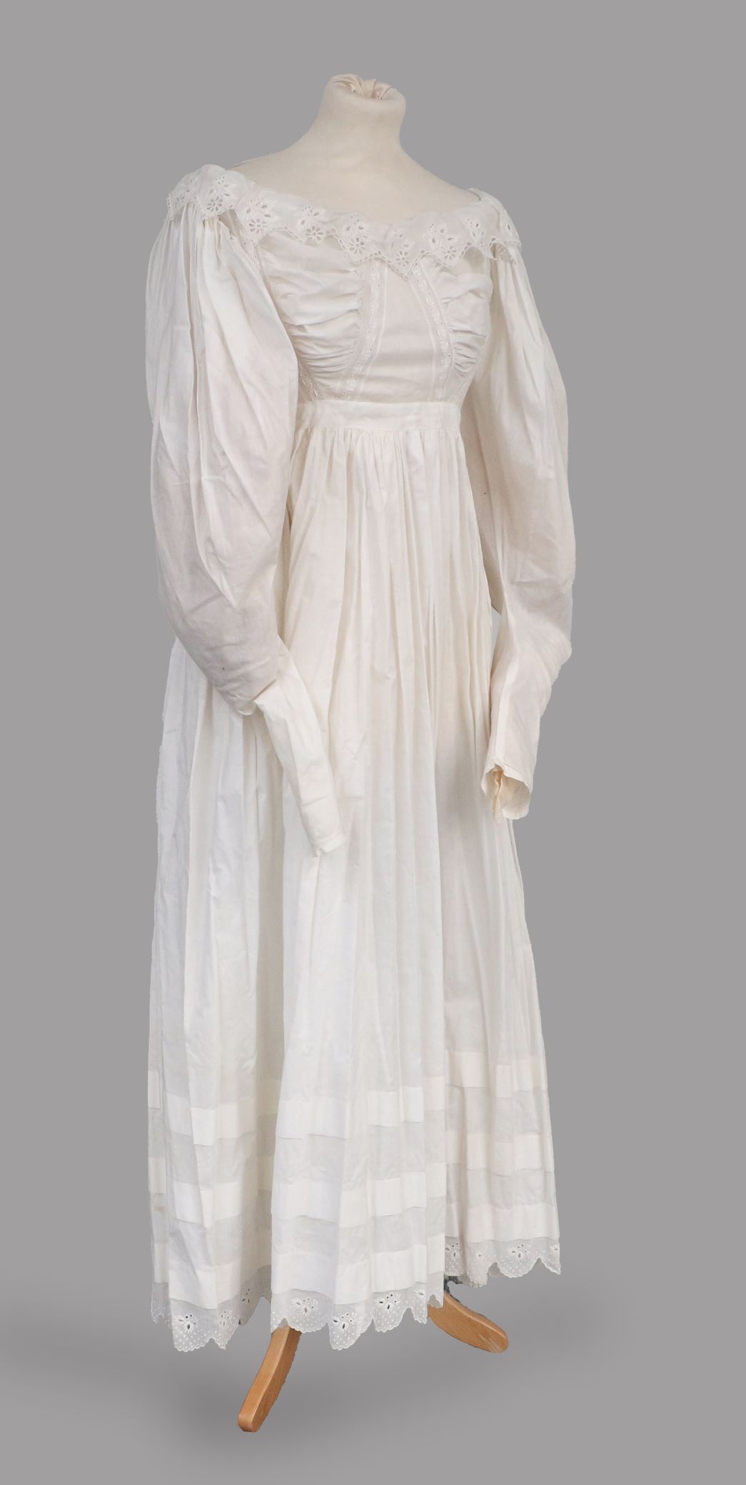 Amongst the antique costume are several pairs of 18th century shoes, including a pair of Late 18th Century Green Silk Lady’s Shoes with geometric applique trims (estimate: £800-1,200), and a pair of Late 18th Century Green Silk Damask Lady’s Shoes (estimate: £600-800). Dating from the same era is a Cream Silk Sack Back Robe, woven with floral posies (estimate: £300-500). From the 19th century comes the group of ten articles of men’s livery uniform, comprising Black Wool Livery Coats with brass buttons by Simpson & Sons of South Audley Street, London, which bear coronets and the initials ‘de D la T’, six Yellow Wool Livery Waistcoats, and two pairs of Grey Wool Breeches (estimate: £200-300). Also of interest is a beautifully embroidered Gent’s 19th Century Cream Silk Waistcoat (estimate: £120-180), an Early 19th Century Possibly Indian White Cotton Muslin Dress (estimate: £250-350), and a Circa 1930s White Cotton Dress (estimate: £200-300). Dating from the 1930s is an unusual and stylish Cream Chamois Leather Lady’s Motoring Coat, Hat and Veil (estimate: £200-300).