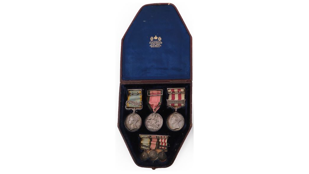 Further good lots of medals include a Second World War DFM Group of Five Medals awarded to Albert (Nobby) Larkins, who flew in Halifax bombers and was awarded a Distinguished Flying Medal for his efforts during a very successful bombing raid of a munitions plant near Berlin. His aircraft came under heavy anti-aircraft fire and was holed a number of times (estimate: £3,000-4,000). The medals comprise the Distinguished Flying Medal, 1939-45 Star, Air Crew Europe Star with Clasp FRANCE AND GERMANY, Defence Medal and War Medal, sold together with photographs, press cuttings and logbooks relating to Larkins. A Victorian group of three medals from the Crimean War awarded to Alexander Dickson of the 62nd Regiment are offered with an estimate of £800-1,200. The medals comprise the Crimea Medal with clasp SEBASTOPOL, the Turkish Crimea Medal (Sardinia Issue) and Indian Mutiny Medal with clasp DELHI.