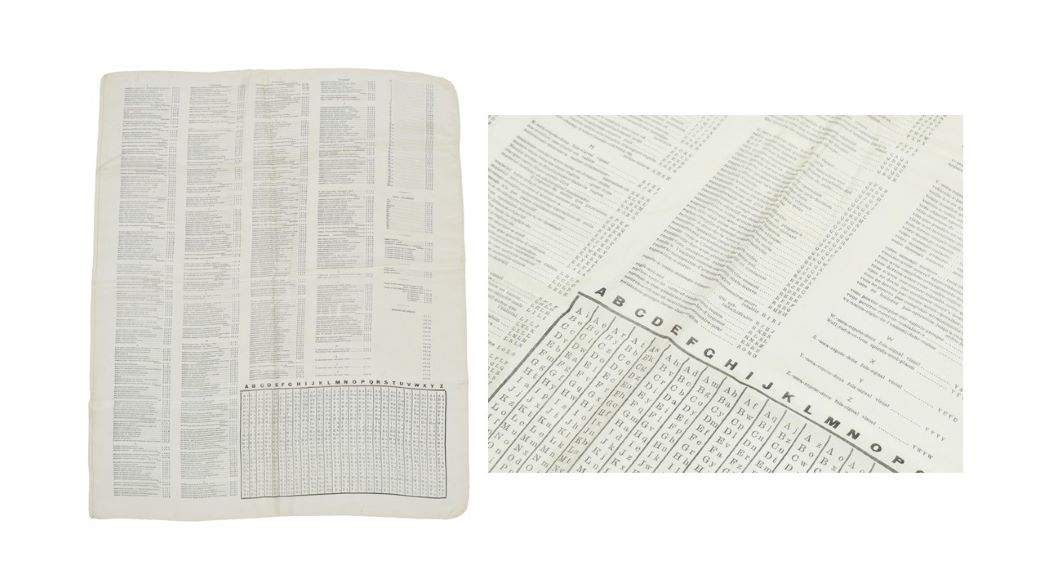 Coming up for sale in Tennants Auctioneers’ Militaria and Ethnographica auction on 16th December is a very rare Second World War Cryptology Silk, printed with a list of French codes (estimate: £400-600 plus buyer’s premium). The silk square belonged to Joyce Mary Pimblott, who was a Cypher Officer for the Special Operations Executive handling communications with the French Resistance and British secret agents operating in France.