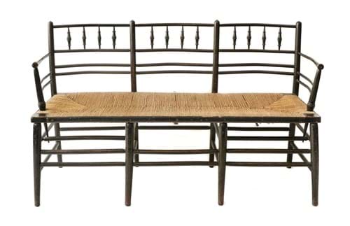 The range was designed circa 1860 and was put into production from 1865. Initially comprising chairs and armchairs, the Sussex range exemplified the simplicity and beauty of the Arts and Crafts ideal, matching of form and function with simple turned frames, stained black, and rush seats. Morris himself had numerous pieces from the Sussex range in his home, the Red House, which had been designed by Webb, as did his friends such as Edward Burne-Jones and Dante Gabriel Rossetti. Proving a great commercial success, the range was expanded to incorporate children’s chairs, a corner chair, and a settee, and influential retailers such as Liberty’s and Heals would produce their own versions.