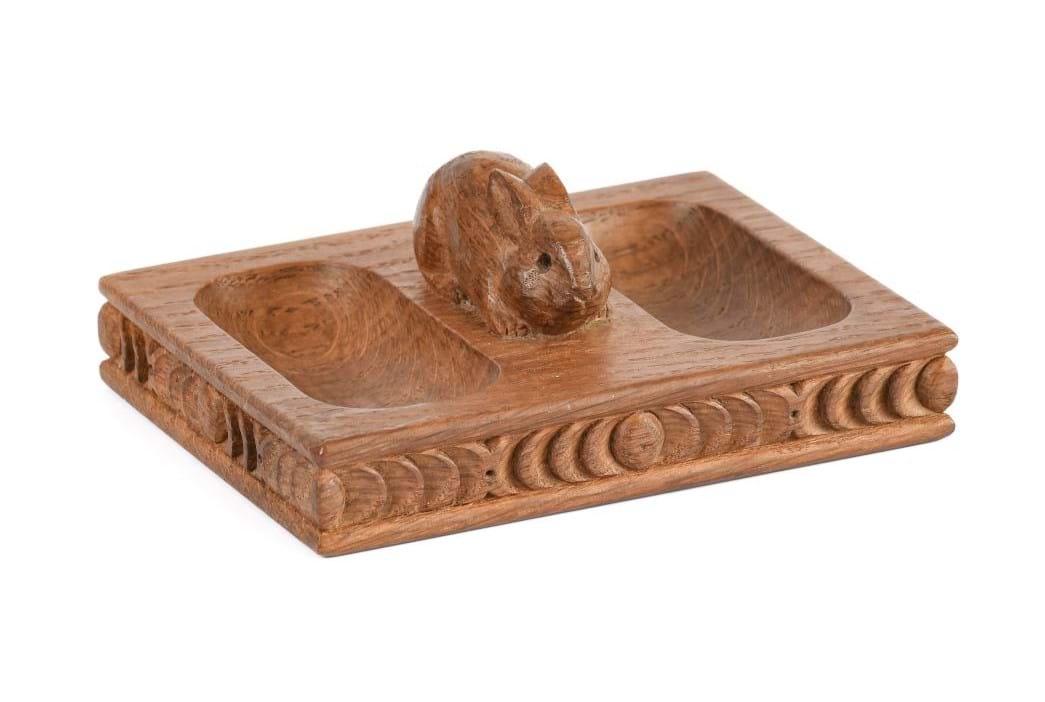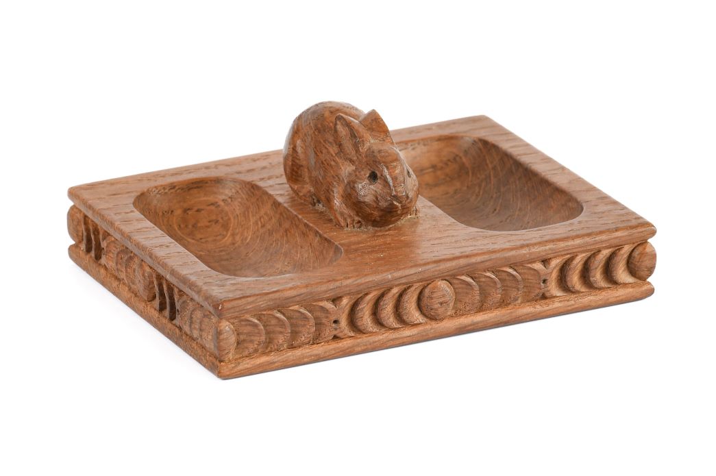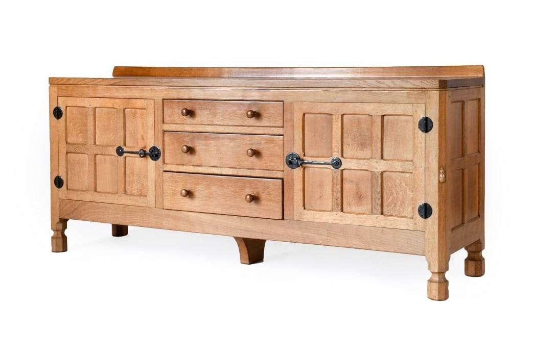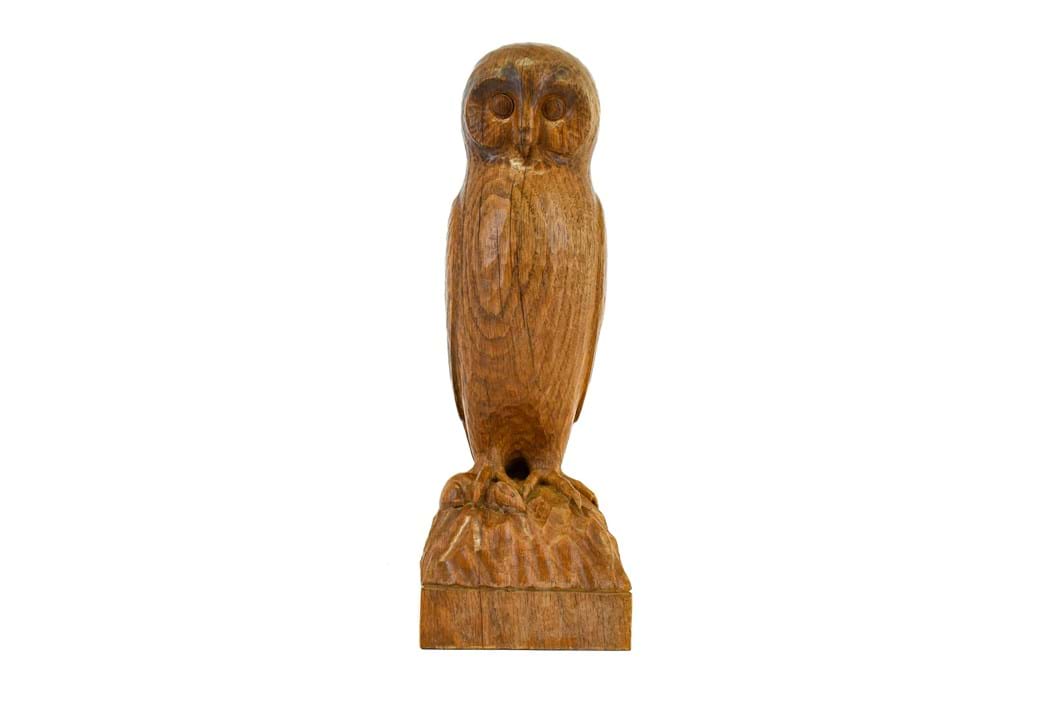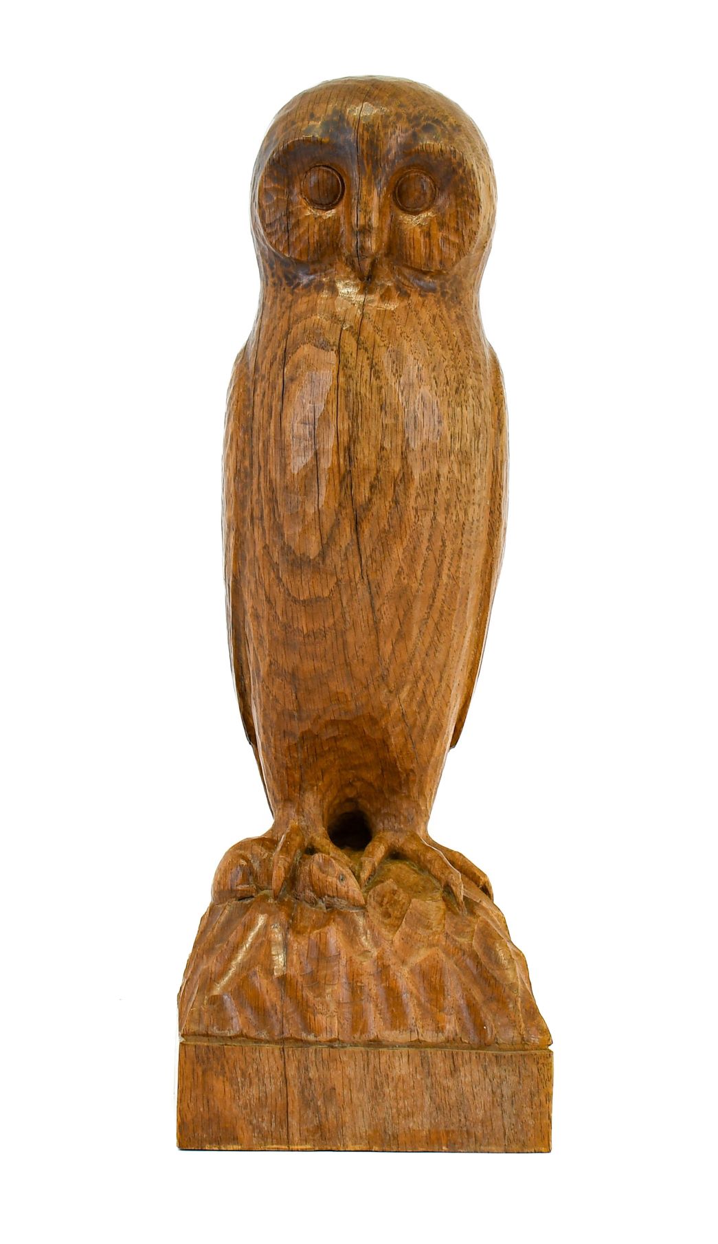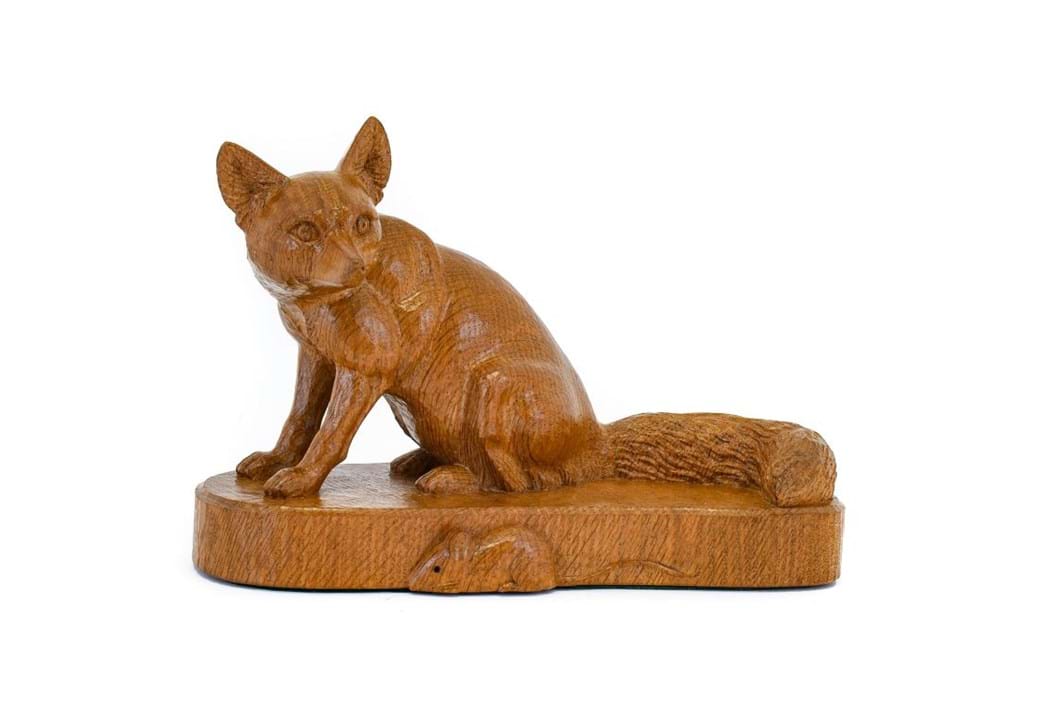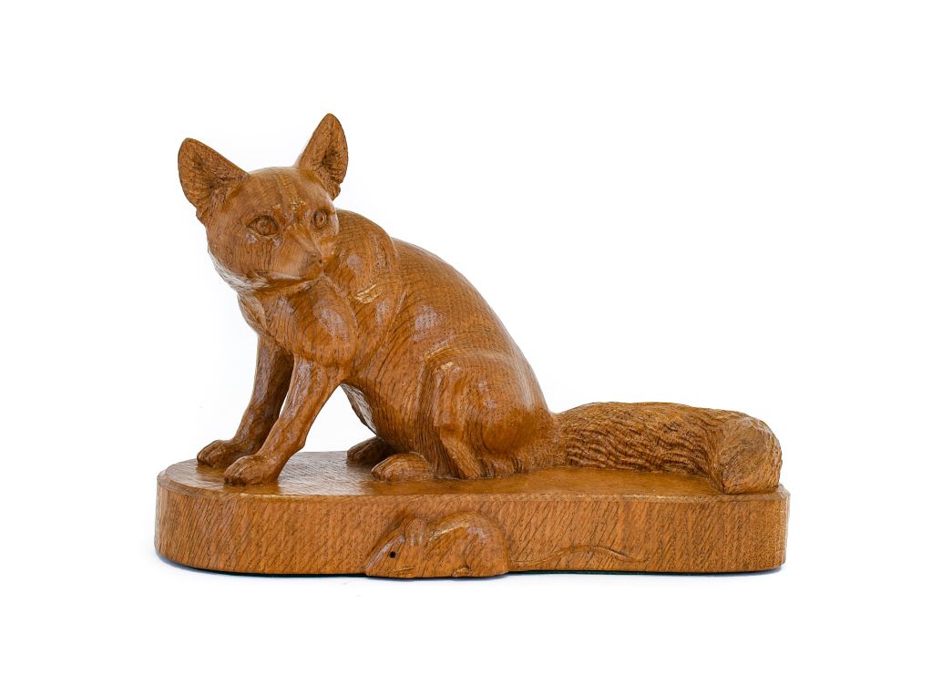 Yorkshire oak furniture and furnishings once again proved its strength in Tennants Auctioneers’ 20th Century Design Sale on 25th June, which saw exceptional prices for pieces by both Mouseman and the ‘Critter’ craftsmen and generated a total hammer price for £142,110 for 177 lots, 73% of the sale total. Topping the sale was a 6-foot Mouseman sideboard, which sold for £5,500 (plus buyer’s premium), sideboards being amongst the most popular designs of Mouseman furniture at auction due to their practical and useful nature. A good Burr oak kidney table sold for £2,700, a newel post cap carved in the shape of an owl with mouse in one talon sold for £3,000, a carved mouse standing on a truckle of cheese sold for £3,800, and an oak fox carving by Stan Dodds for Mouseman sold for £5,200.