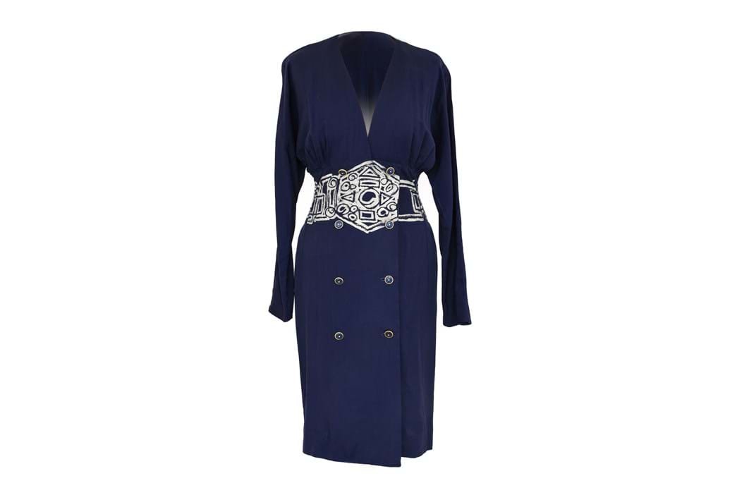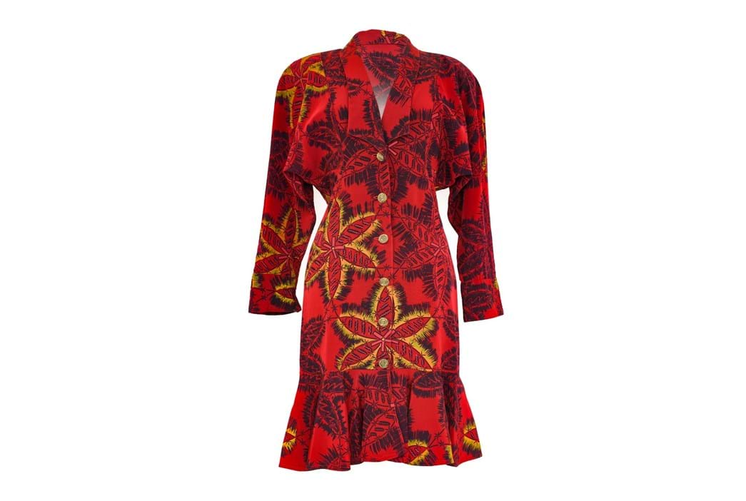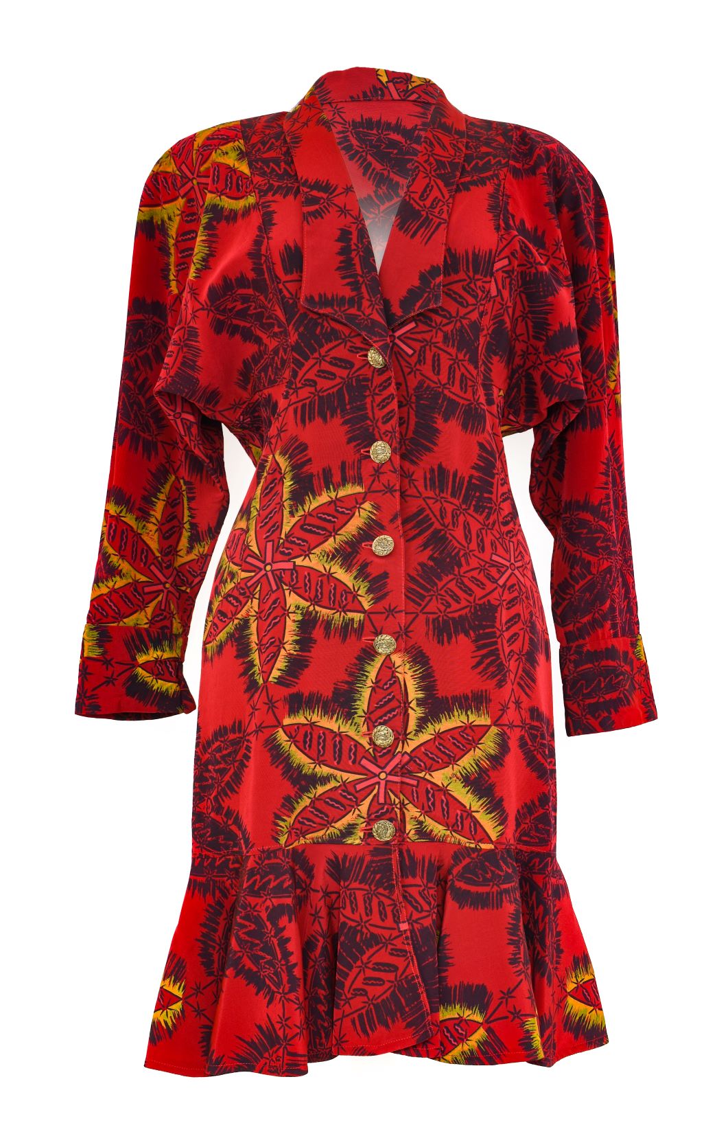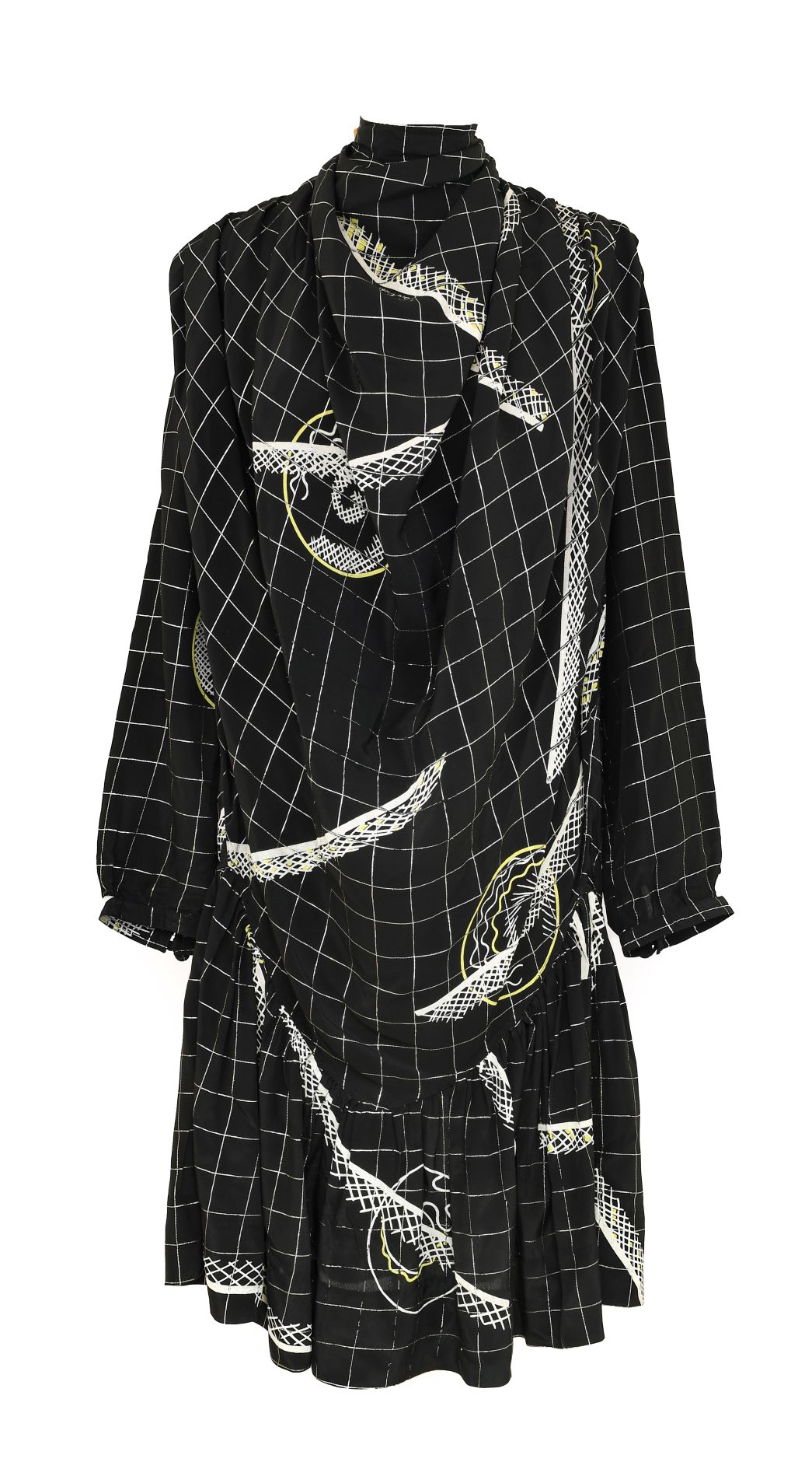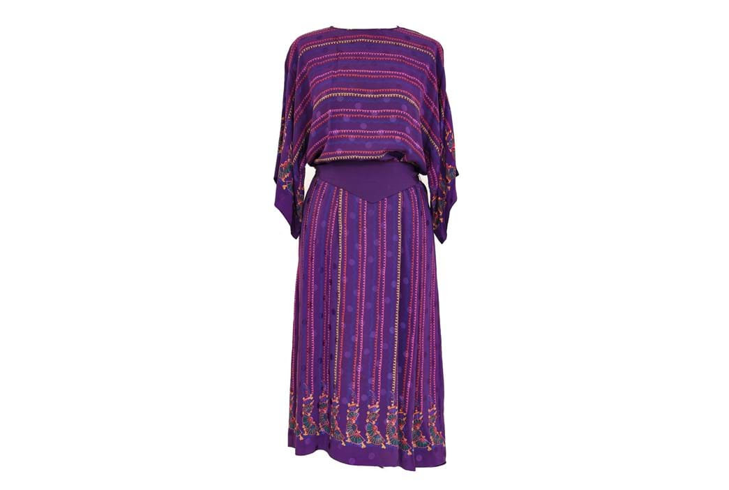 However, these controversial designs were deemed outrageous by the traditional British retailers in the 1960s and she failed to establish herself within Britain. Rhodes moved to New York, and it was here that she caught the eye of the Vogue Editor Marit Allen who in 1969 included her works American Vogue. Allen helped Rhodes sell her collections to the big brands in the US like Henri Bendel and Saks. This allowed Rhodes to be taken seriously in the UK and she went on to sell clothes in Fortum and Masons. She became part of the new wave of British designers who put London on the international fashion scene in the 1970s. Her flowing forms of vibrant colour and patterns were creative statements in their originality. Her early inspirations were the likes of Andy Warhol and Emilio Pucci, which is reflected throughout her career. As she progressed, she began to take inspiration from international cultures, using Native American India symbols, Chevron stripes from the Ukraine and Japanese flowers, which are evident in the dresses and scarfs shown here. Her aim was for her clothes to be simple and functional in shape and yet wild in design.